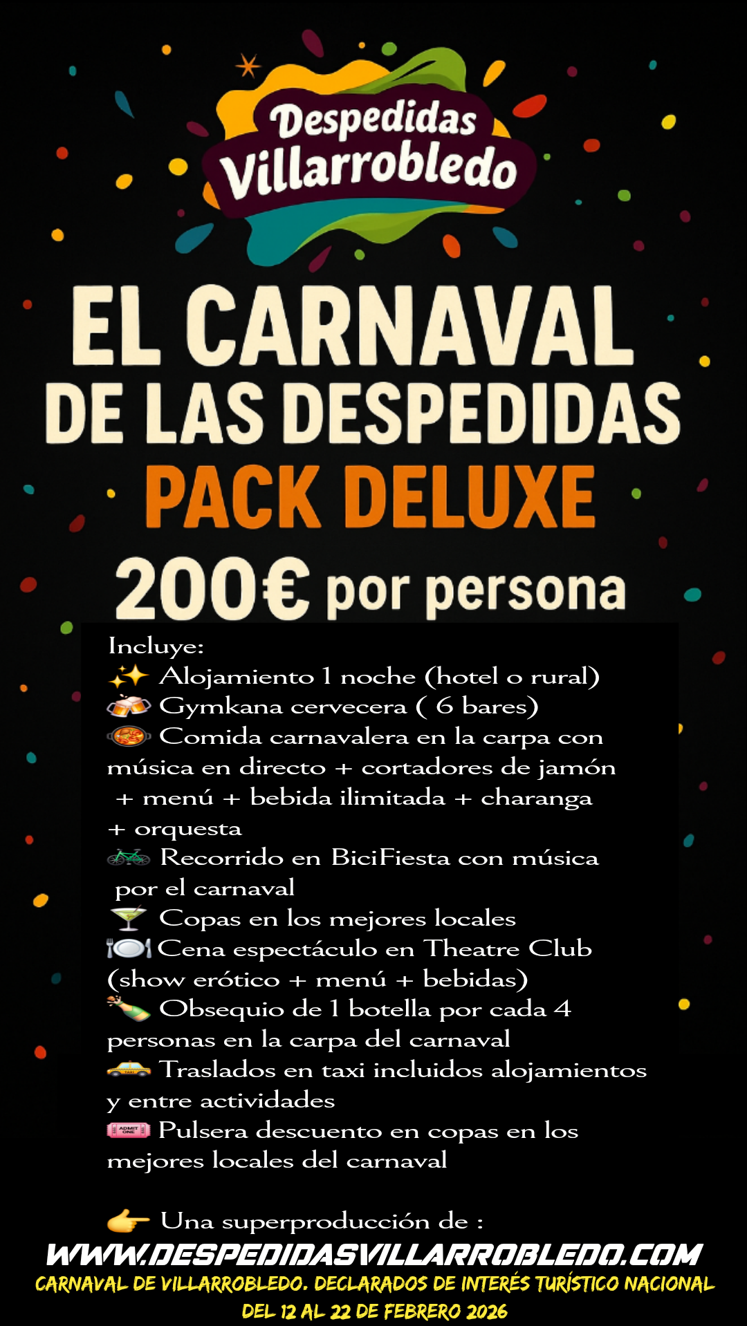 EL PACK THE LUXE ES EL COMPLEMENTO PERFECTO AL CARNAVAL DE VILLARROBLEDO, LAS ACTIVIDADES PROGRAMADAS SON COMPATIBLES CON LA PROGRAMACION DE FIESTAS DE LA LOCALIDAD.